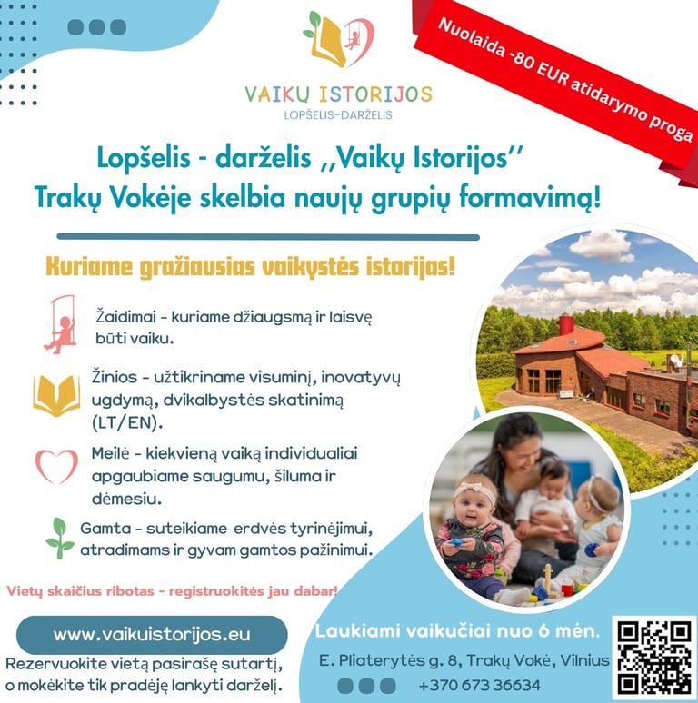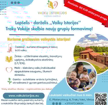 „Vaikų istorijos“ vaikučių tėveliams nereikia rūpintis dėl papildomo mažųjų ugdymo, į ugdymą integruotos anglų kalba, lego, keramikos užsiėmimai, eskursijos ir dar daug visko.